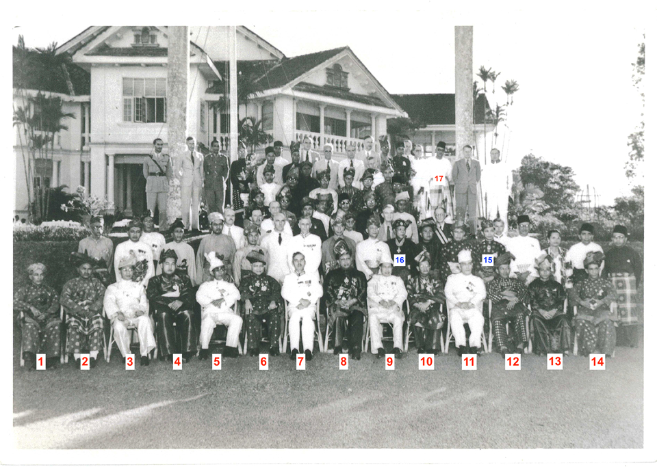 Senarai nama ini mengenal pasti Raja-raja Melayu dan wakil British yang duduk di barisan hadapan. Individu lain yang terdapat dalam gambar ini termasuk Menteri Besar, wakil Raja-raja Melayu, wakil Pertubuhan Kebangsaan Melayu Bersatu (UMNO), pegawai British, serta penasihat undang-undang. Sekiranya anda mengenali mana-mana individu yang tidak disenaraikan, sila maklumkan kepada petugas galeri. Terima kasih.